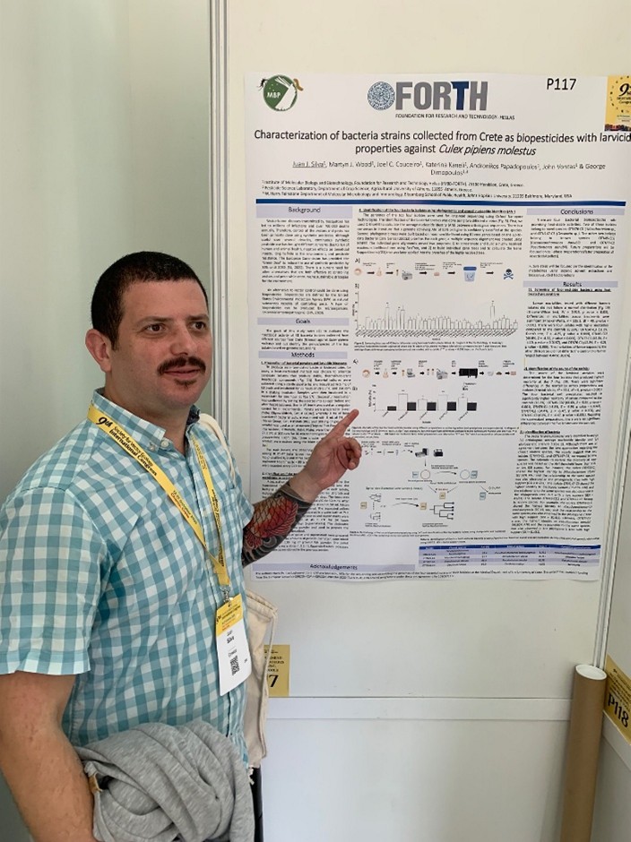 The poster presented by the post-doctoral researcher Juan Silva (Characterization of four bacteria strains collected from Crete as inactivated biopesticides with larvicide and adulticide properties against Aedes albopictus and Culex pipiens molestus) reported on the screening and characterization of bacterial isolates for mosquito control. Forty isolates obtained from diverse habitats in Crete were initially evaluated against larvae of Culex pipiens molestus using heat-inactivated preparations to identify strains producing heat-stable insecticidal compounds. The top four isolates with the highest activity were selected for further characterization. A second assay to identify the source of the toxins revealed that insecticidal activity was associated with cell components rather than secreted metabolites in the culture medium. Genomic sequencing and analysis identified two isolates as belonging to known species, and two isolates assigned to novel species of the genera Microbacterium and Oerskovia.
