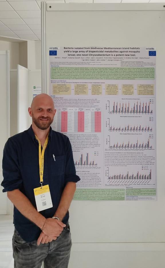 The oral presentation (Discovery of novel bacteria that produce heat-stable metabolites with insecticidal activity against Culex pipiens molestus) given by the PhD student Andronikos Papadopoulos reported on his work with bacterial metabolites exhibiting insecticidal activity. After a preliminary screening with 501 isolates, and a secondary screening with 35 isolates, five isolates were selected for further characterization. Larvicidal and adulticidal assays resulted in high mortality, and sublethal effects in the population. Genome sequencing revealed that three isolates also belong to new species, and a Pfam protein analysis indicated two isolates producing chitinases, which could be responsible for the insecticidal activity.