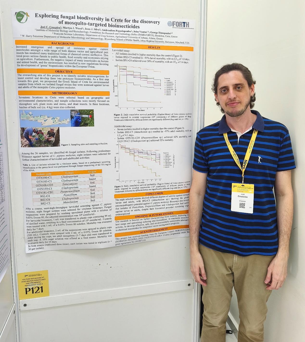 The poster (Exploring fungal biodiversity in Crete for the discovery of mosquito-targeted biopesticides) presented by the post-doctoral researcher Joel da Cruz Couceiro reported on the sampling of natural habitats in Crete to obtain fungal isolates that could present potential for mosquito control. Bioassays against larvae of Culex pipiens molestus resulted in 8 candidates, that then were assessed for adulticidal activity against this mosquito species, revealing isolates of Metarhizium, Cladosporium and Purpureocillium with activity against both mosquito life-stages.