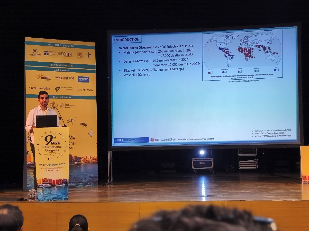 The oral presentation (Discovery of novel bacteria that produce heat-stable metabolites with insecticidal activity against Culex pipiens molestus) given by the PhD student Andronikos Papadopoulos reported on his work with bacterial metabolites exhibiting insecticidal activity. After a preliminary screening with 501 isolates, and a secondary screening with 35 isolates, five isolates were selected for further characterization. Larvicidal and adulticidal assays resulted in high mortality, and sublethal effects in the population. Genome sequencing revealed that three isolates also belong to new species, and a Pfam protein analysis indicated two isolates producing chitinases, which could be responsible for the insecticidal activity.
